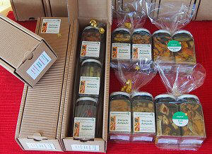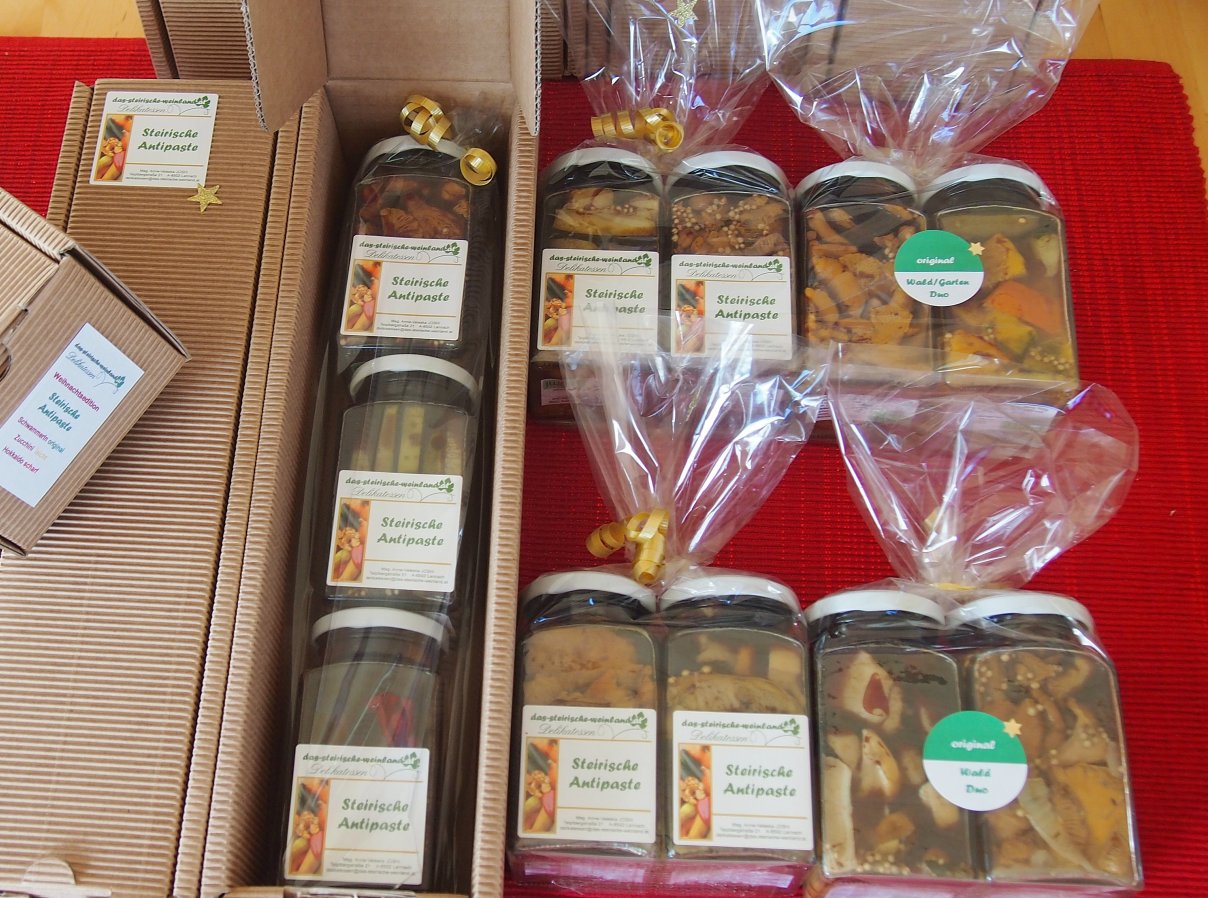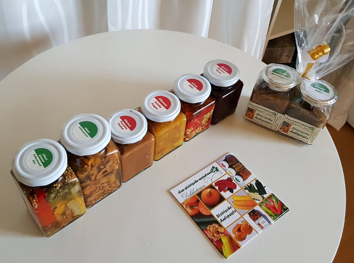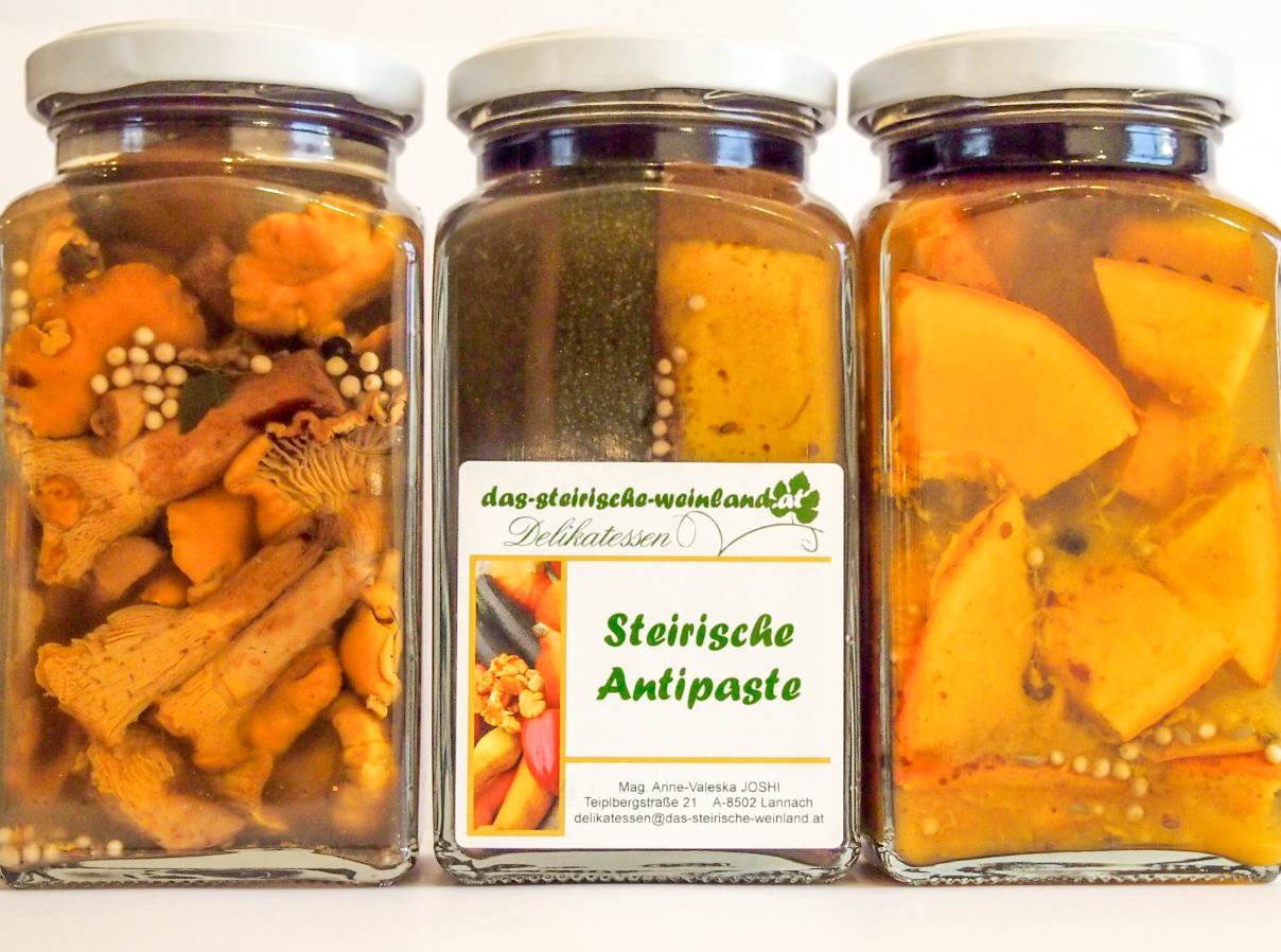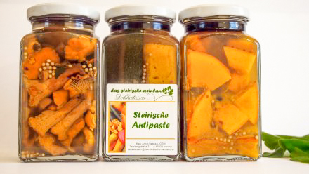 Paradeis-Dattel-Chutney Kürbis-Feigen-Chutney Beeren-Wein-Gelee Melanzani rustikal in Olivenöl bunte Chili pikant in Olivenöl Eierschwammerln pikant MIX Eierschwammerln-Gemüse pikant diverse Minis (Chili, Beeren-Wein-Gelee, Eierschwammerln, Chutney) DUO Wald pikant (Schwammerln - Pilze) Scharfes DUO (Chili oder Schwammerln pikant&scharf - Chutney) DUO Chutney (Paradeis - Kürbis) Mini TRIO DUO Wald-Garten pikant (Schwammerln - Gemüse)